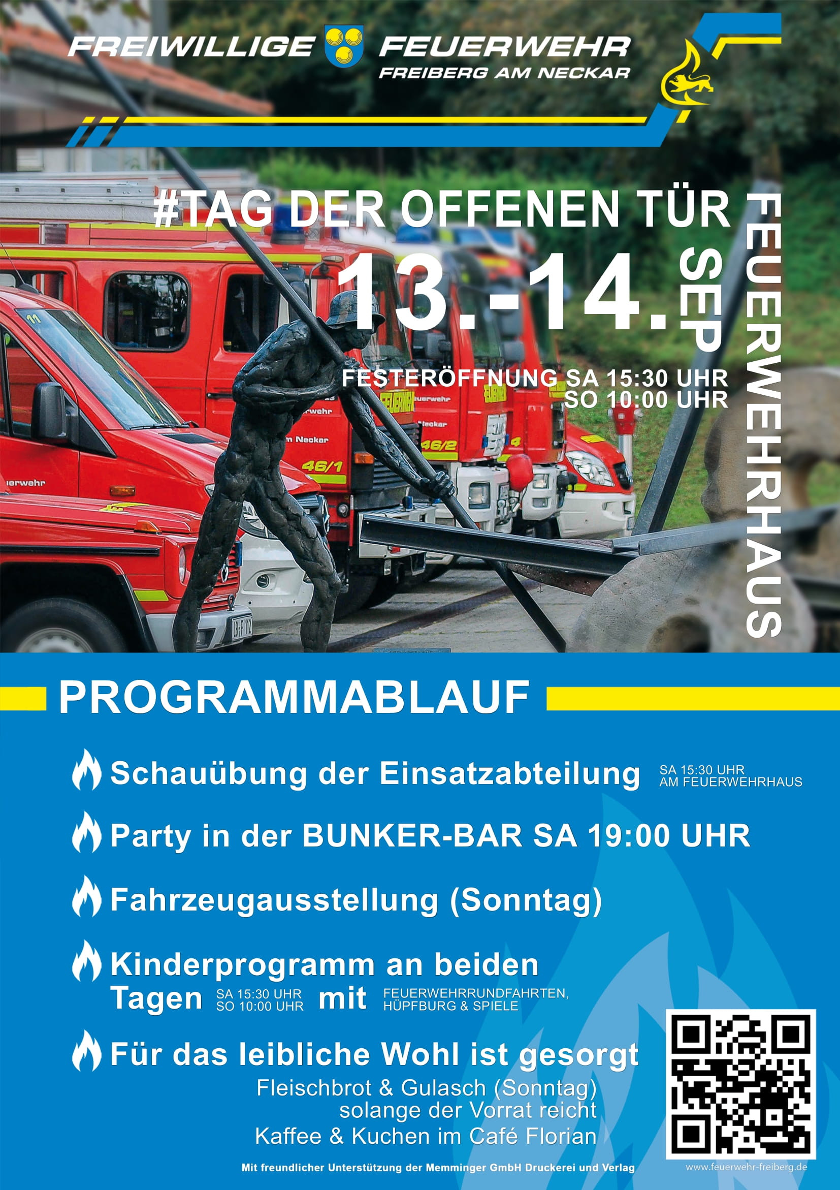 Herzliche Einladung zum Tag der offenen Tür!Am 13. und 14. September öffnet die Freiwillige Feuerwehr Freiberg am Neckar ihre Tore – wir freuen uns darauf, Sie bei uns willkommen zu heißen!