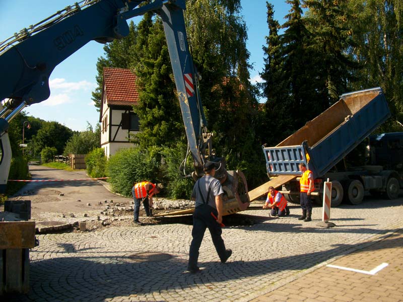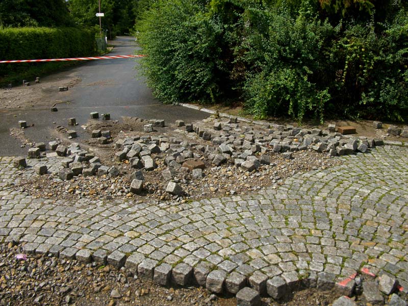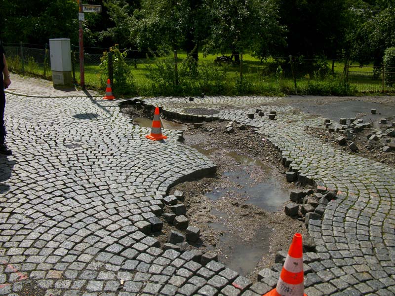 Der allerdings schwerste der 28 verschiedenen Einsätze an diesem Tag, war sicherlich die überflutete Bietigheimer- und Wernerstraße, Dort spülten die Wassermassen Pflastersteine aus dem Fahrbahnbelag. Es kam ein Radlager des Bauhofes und ein Bagger sowie ein LKW einer in Freiberg ansässigen Firma zum Einsatz.