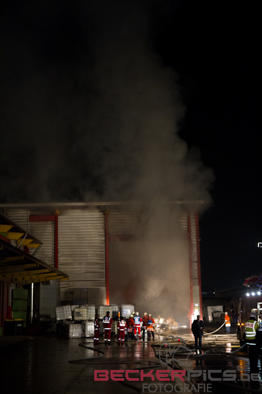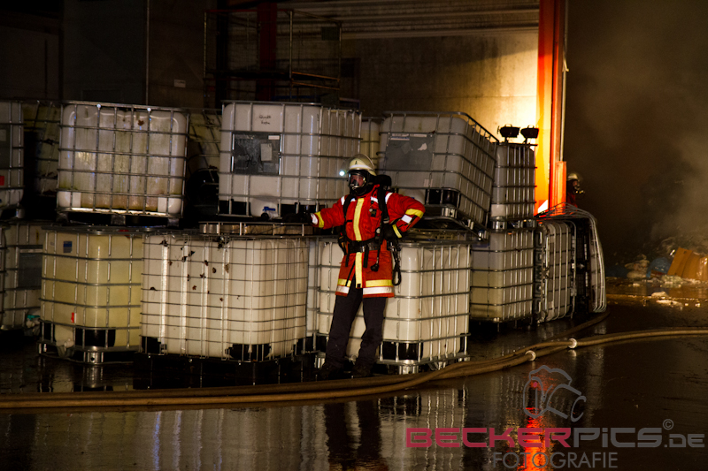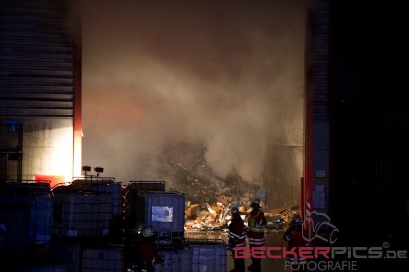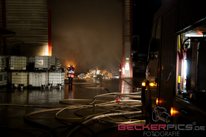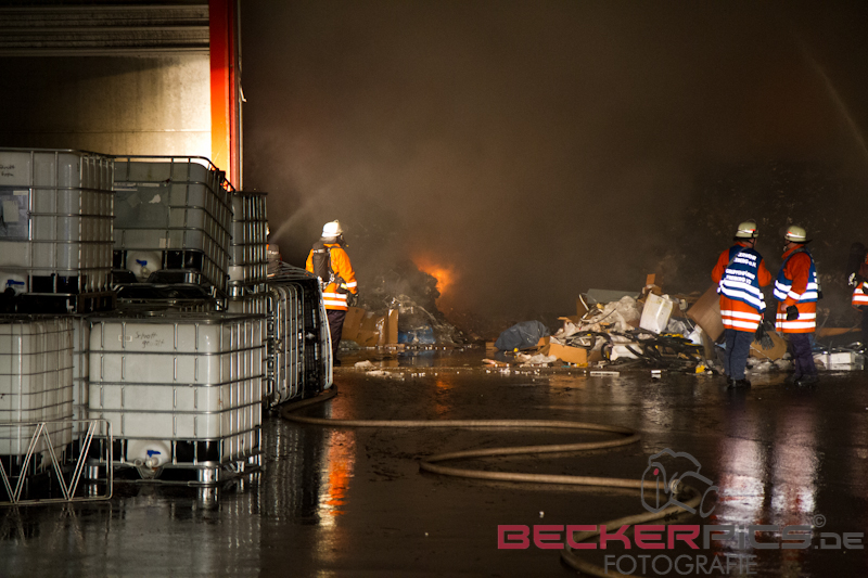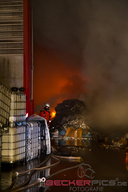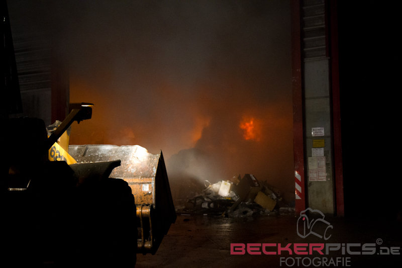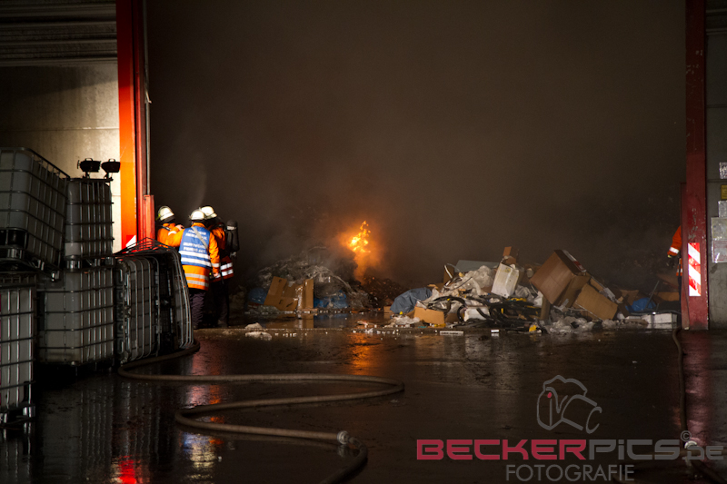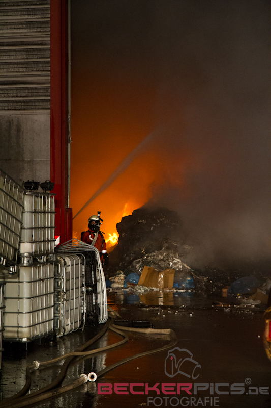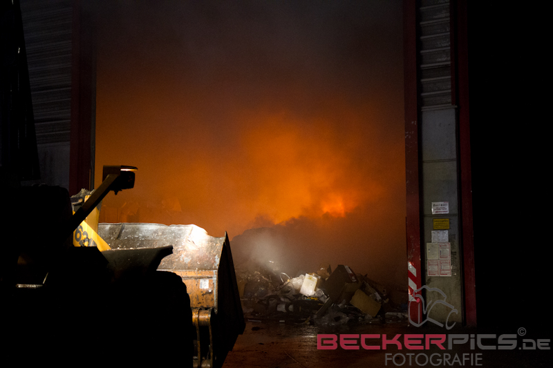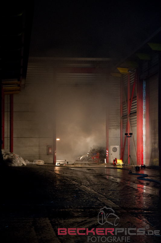 Als die ersten Einsatzkräfte an der Einsatzstelle ankamen, fanden Sie eine Lagerhalle vor, in der rund 300 cbm Gewerbemüllabfälle in voller Ausdehnung brannten.