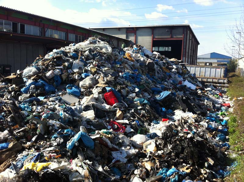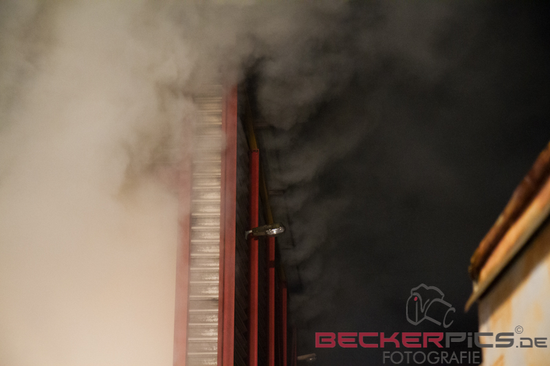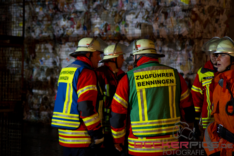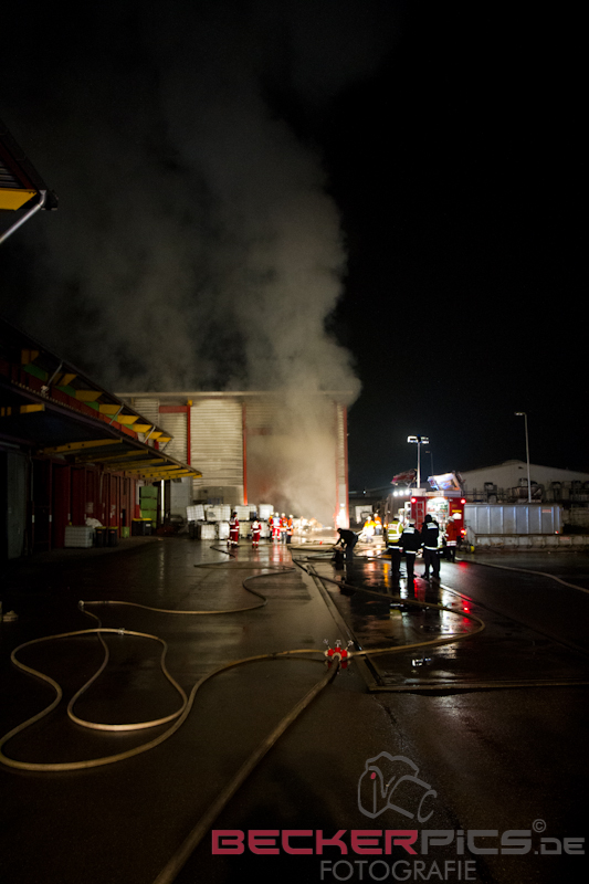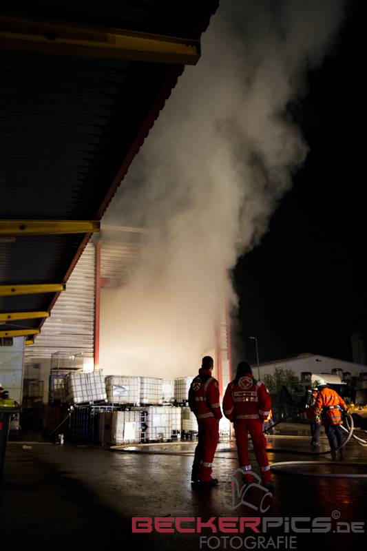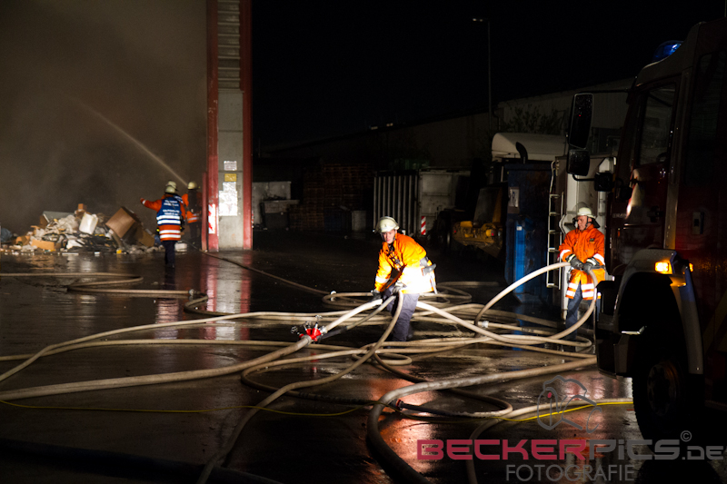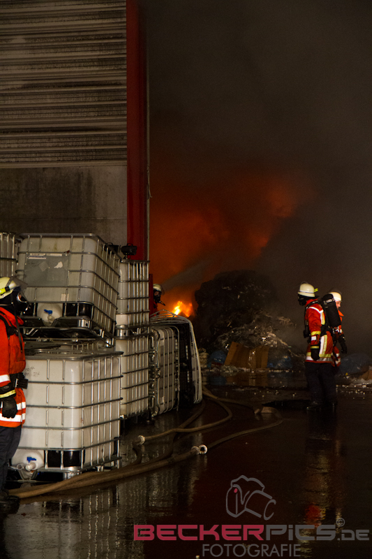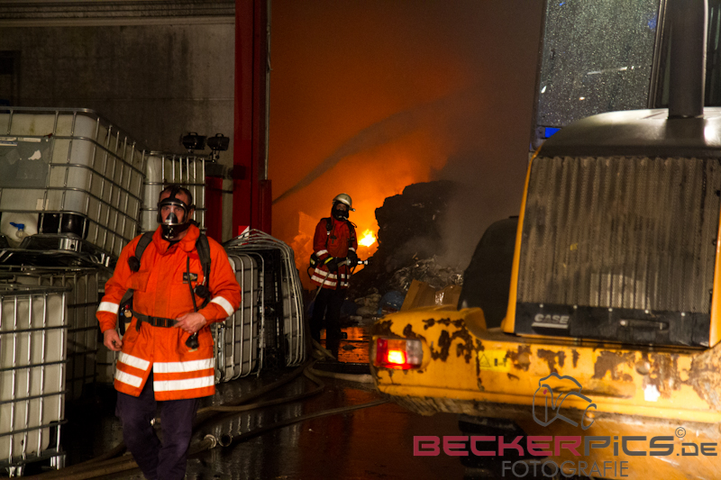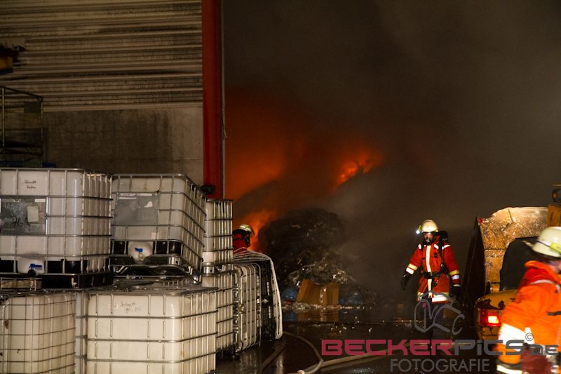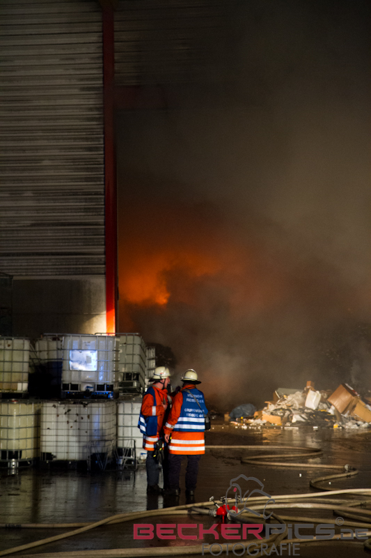 Als die ersten Einsatzkräfte an der Einsatzstelle ankamen, fanden Sie eine Lagerhalle vor, in der rund 300 cbm Gewerbemüllabfälle in voller Ausdehnung brannten.