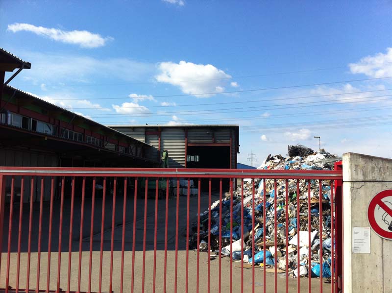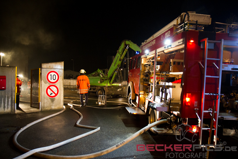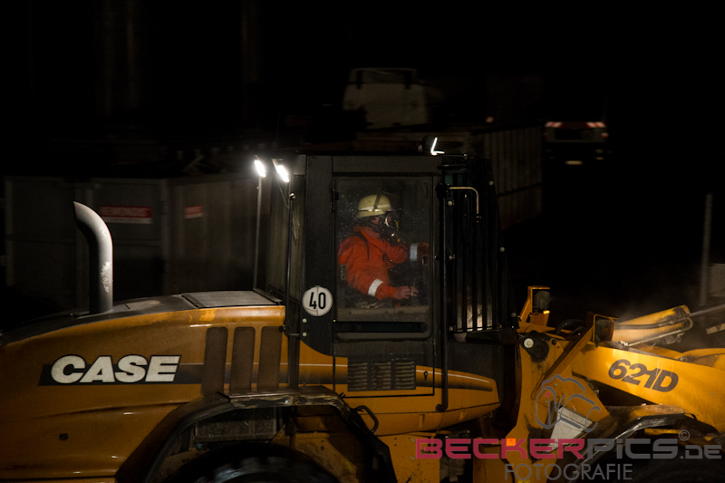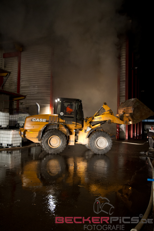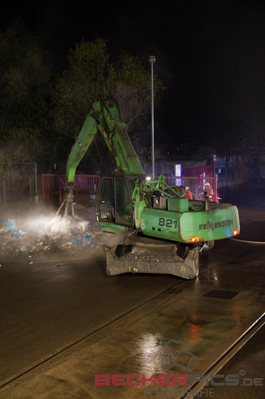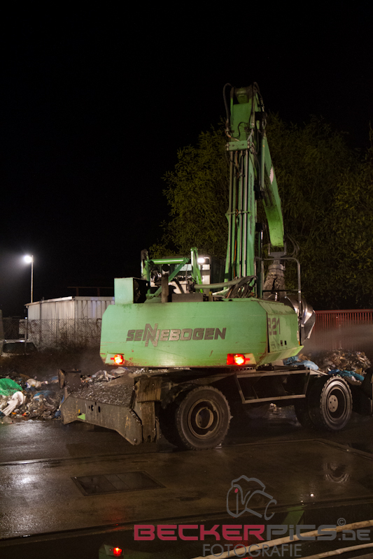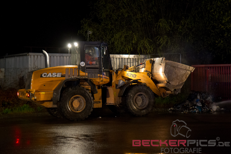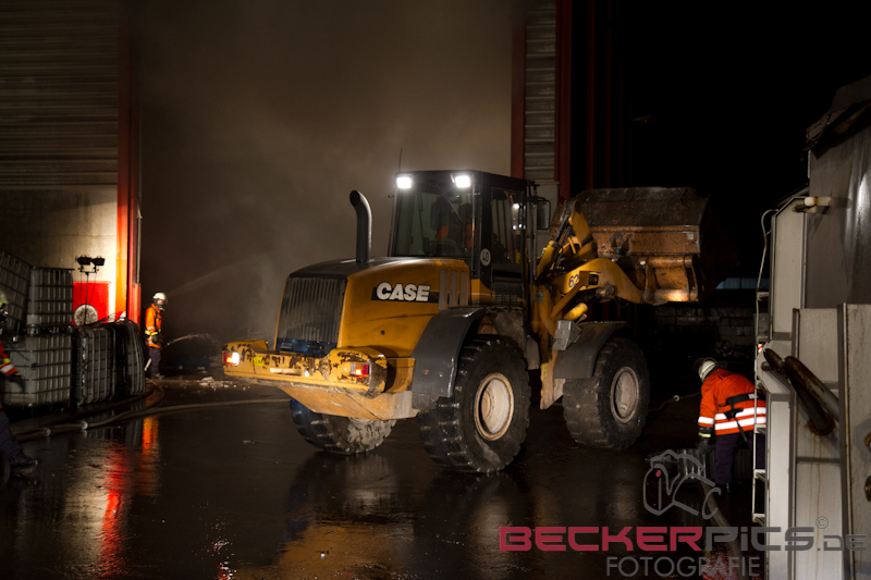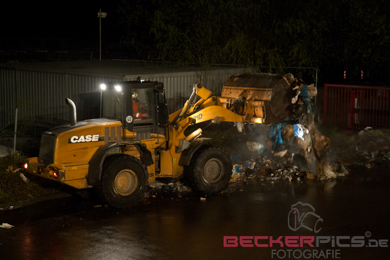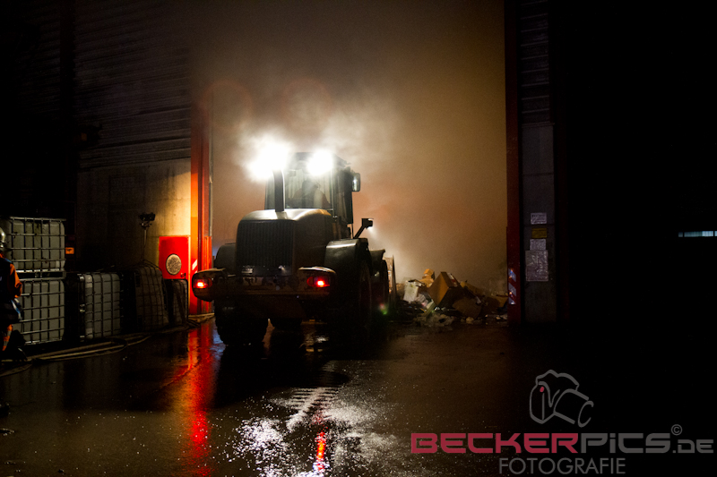 Noch während der Löscharbeiten räumte man mit dem firmeneigenen Radlader, der mit einem Feuerwehrmann mit Atemschutz besetzt war, die Lagerhalle aus, um die Abfälle außerhalb der Halle abzulöschen.