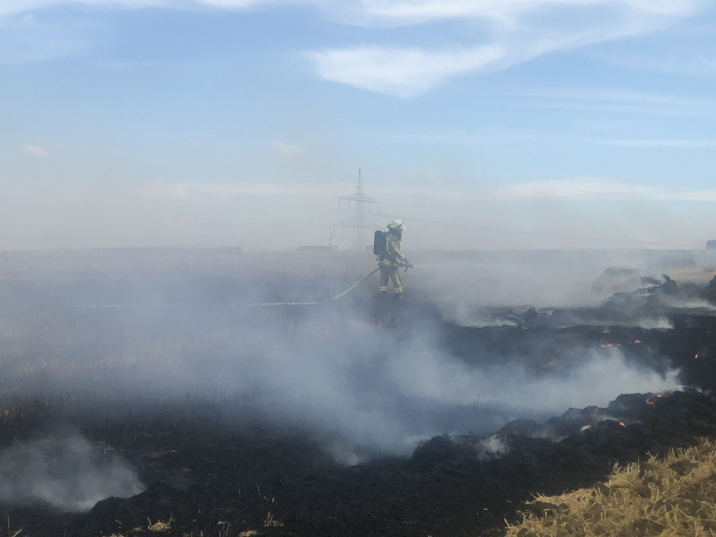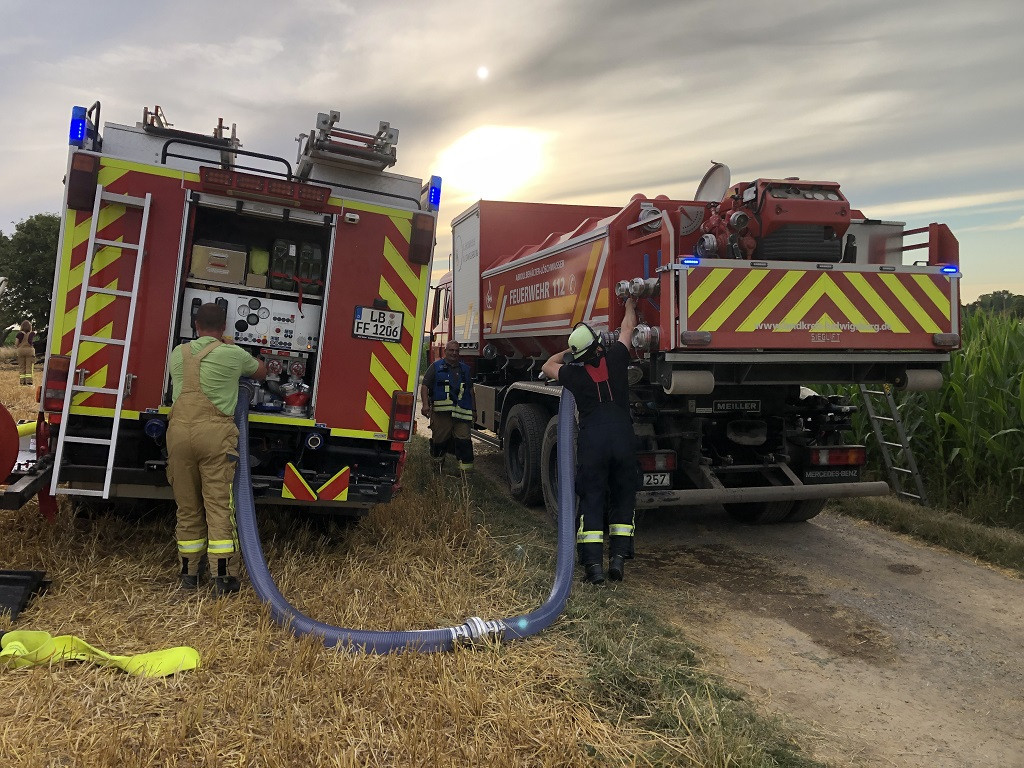 Zu einer brennenden Heuballenpresse auf freiem Feld wurde die Große Schleife der Feuerwehr Freiberg am 06.07.2022, um 17:58 Uhr alarmiert. Bereits auf der Anfahrt wurde das TLF 20-40 und der Wechsellader mit dem AB Löschwasser der Feuerwehr Ludwigsburg nachgefordert. Für die Brandbekämpfung wurden fünf Trupps eingesetzt, davon drei unter Atemschutz, dabei waren fünf C-Rohre im Einsatz. Zu Beginn der Löscharbeiten wurde zunächst ein Pendelverkehr zur Wasserversorgung eingerichtet, später unterstützte der Wechsellader mit AB Löschwasser der Feuerwehr Ludwigsburg die Wasserversorgung an der Einsatzstelle. Durch einen Landwirt wurden die Flächen an der Einsatzstelle umgepflügt, damit konnte eine weitere Brandausbreitung größtenteils verhindert werden. Der Traktor der Ballenpresse wurde durch die Flammen nur leicht beschädigt. Es wurden anschließend noch umfangreiche Nachlöscharbeiten durchgeführt.