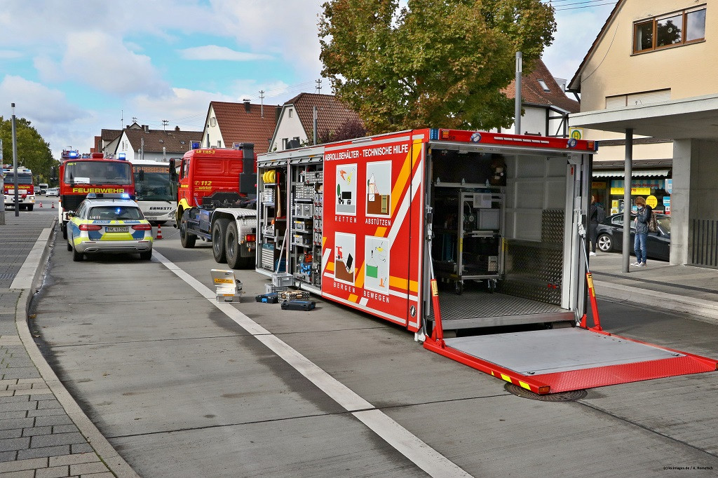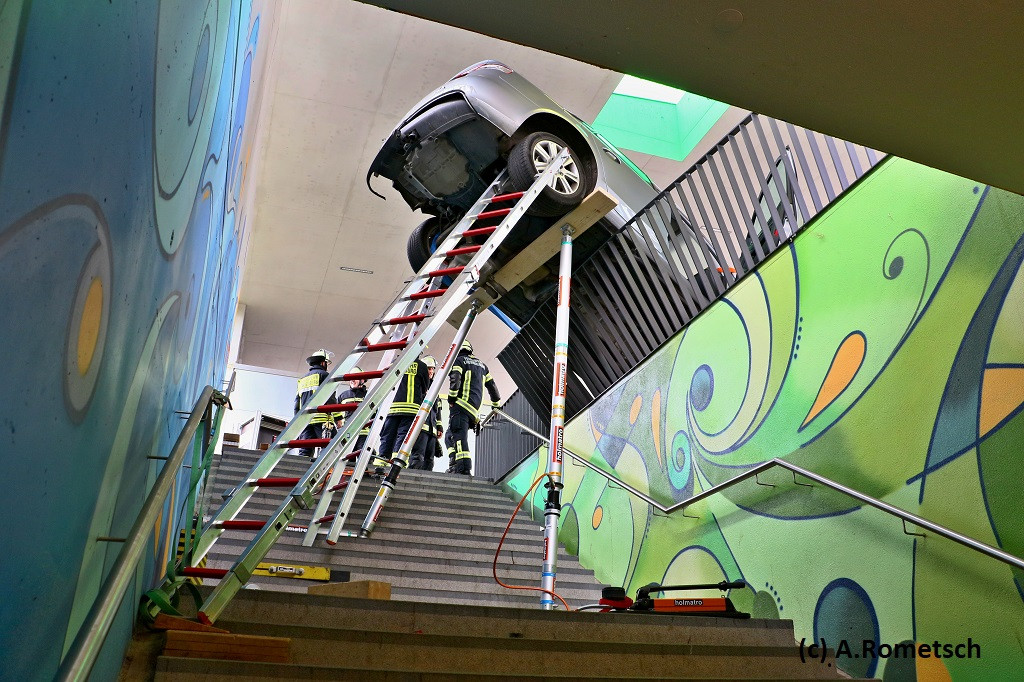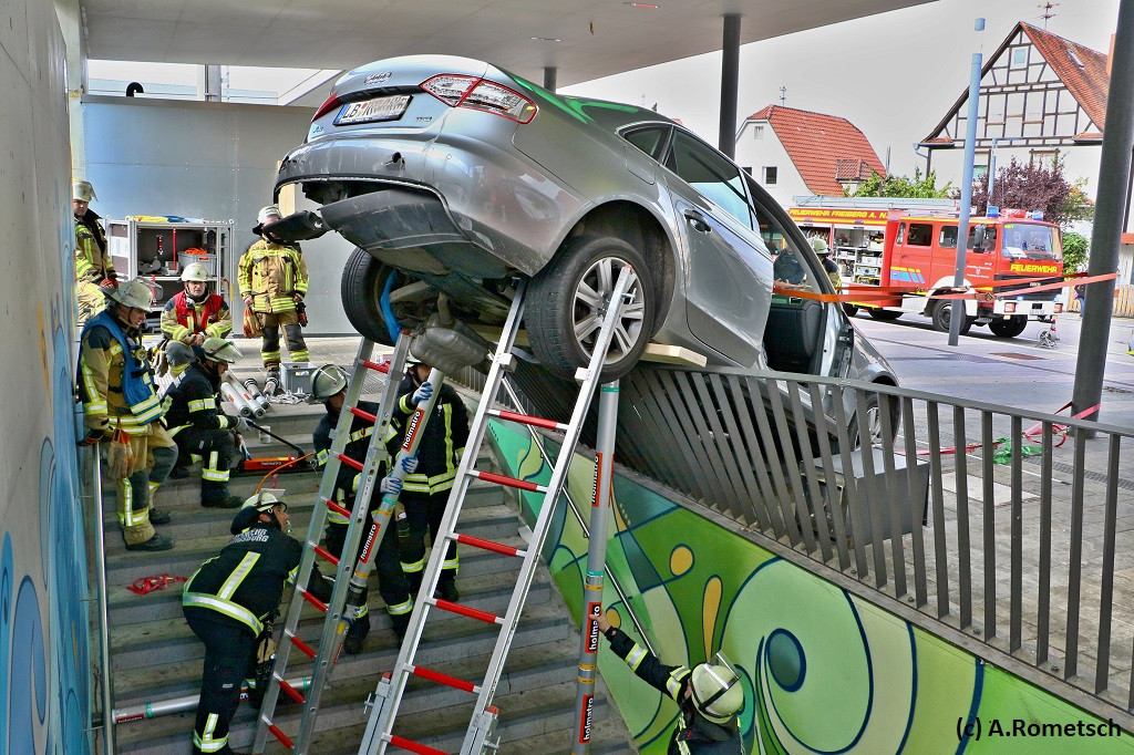 Die Große Schleife der Feuerwehr Freiberg wurde am 27.09.2022, um 11:12 Uhr zu einem Verkehrsunfall in der Bahnhofstraße, zunächst unter dem Alarmstichwort „Hilfeleistung 3, eingeklemmte Person“ alarmiert. Als die Einsatzkräfte der Feuerwehr an Unfallstelle erreichten bot sich folge Lage. Direkt neben dem Bahnhofsgebäude war ein PKW Fahrer rückwärts von einem gegenüberliegen Geschäft zunächst über die Bahnhofstraße gefahren, überfuhr dann den Randstein der Bushaltestelle und prallte anschließende mit dem Heck des PKW auf der Geländer der Treppe die zur Bahnhofsunterführung führt. Dort hing das Fahrzeug halb auf dem Geländer, das Heck über dem Treppenraum. Der Fahrer saß bei Ankunft der Feuerwehr noch in seinem Fahrzeug, er war sichtlich unverletzt und nicht eingeklemmt. Die Kräfte der Feuerwehr sicherten zunächst das Fahrzeug mit Steckleiterteilen und Spanngurten und sperrten den Treppenraum ab. Umgehend wurde das Wechselladerfahrzeug der Feuerwehr Ludwigsburg mit dem Abrollbehälter Technische Hilfeleistung (AB-THL) nachgefordert. Zusammen mit den Einsatzkräften aus Ludwigsburg und den Gerätschaften des AB-THL konnte der PKW endgültig stabilisiert, der Fahrer sicher aus seinem Fahrzeug befreit und dem Rettungsdienst übergeben werden. Anschließend konnte die Feuerwehr, gemeinsam mit einem Abschleppunternehmen, die aufwändige Bergung des Fahrzeuges durchführen. Erschwerend kam hinzu, dass zwischen dem Unfallfahrzeug und dem Dach des Bahnhofsplatzes nicht viel Platz für den Einsatz des Bergekrans gegeben war. Die anschließende Sicherung der Unfallstelle und des Treppenabganges übernahmen Mitarbeiter der Technischen Dienste der Stadt Freiberg.