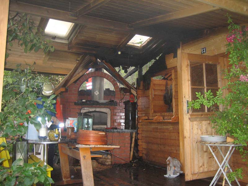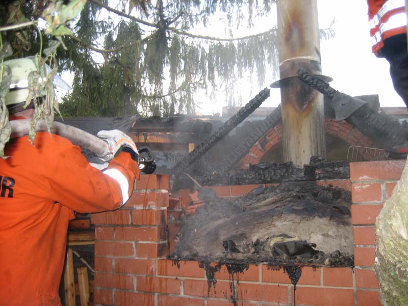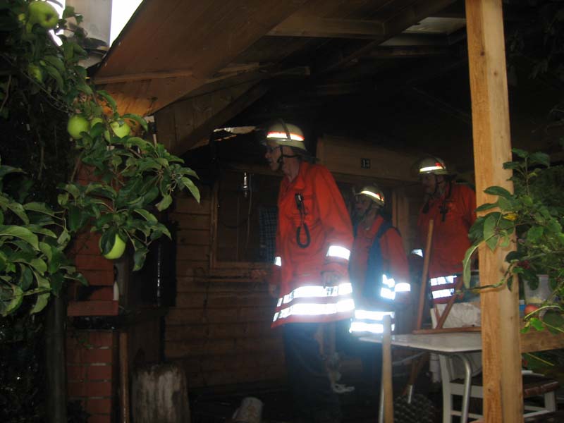 Das Gartenhaus wurde mit 2 C-Rohren gelöscht und die Wärmebildkamera zur Kontrolle ob weitere Glutnester bestehen, eingesetzt.