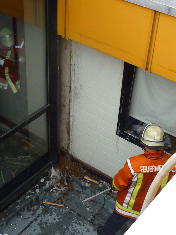 Dieser brach zwischen einem Betonpfeiler und der Betondecke im Stadthallenfoyer aus. Die Dehnfuge wurde entfernt und mit HighPress Löscher gelöscht.