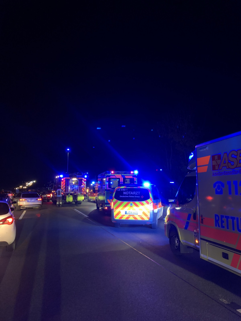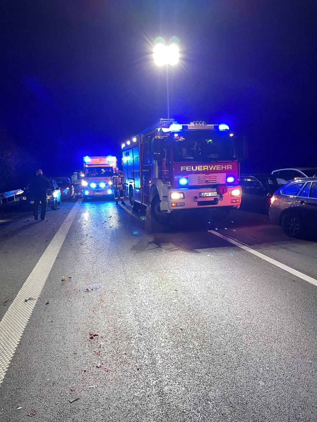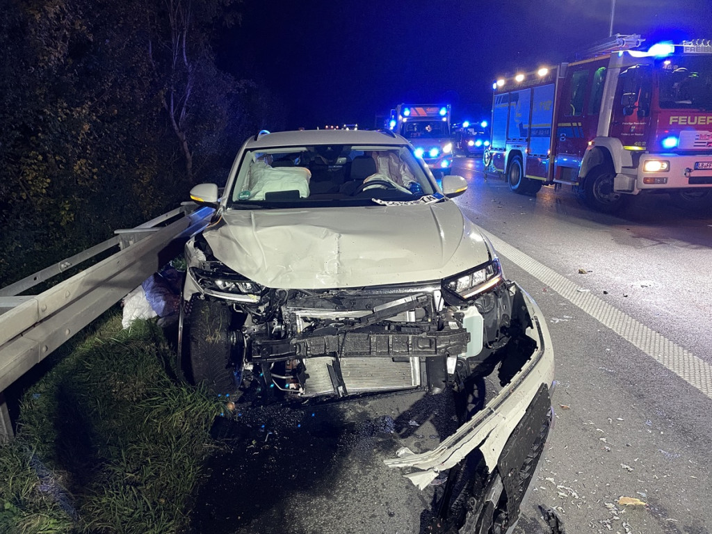 Ebenfalls am 3. November 2024 waren auch die Große Schleife, die Zugschleife 1 und die Kleine Schleife 3 der Feuerwehr Freiberg, zusammen mit der Feuerwehr Ludwigsburg im Einsatz. Sie wurden um 21:59 Uhr zu einem Verkehrsunfall auf der Autobahn A 81, zwischen den Anschlussstellen Ludwigsburg-Nord und Pleidelsheim alarmiert. Dabei blieb ein unfallbeteiligtes Fahrzeug mit Anhänger quer auf den Fahrbahnen, auf die Seite umgekippt liegen. Drei folgende Fahrzeuge konnten nicht mehr rechtzeitig bremsen und fuhren ebenfalls auf die Unfallstelle auf. Es gab vier verletzte Personen von denen zwei von den Rettungsdiensten in eine Klinik gebracht wurden. Die Einsatzkräfte der Feuerwehren leuchteten die Einsatzstelle aus und sicherten sie ab. Auslaufende Betriebsstoffe wurden abgebunden. Die Autobahn Fahrtrichtung Heilbronn war zeitweise voll gesperrt. Die später eingetroffene Autobahnmeisterei übernahm die Absperrmaßnahmen und die Einsatzstelle wurde der Verkehrspolizei übergeben.