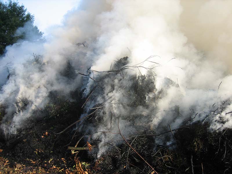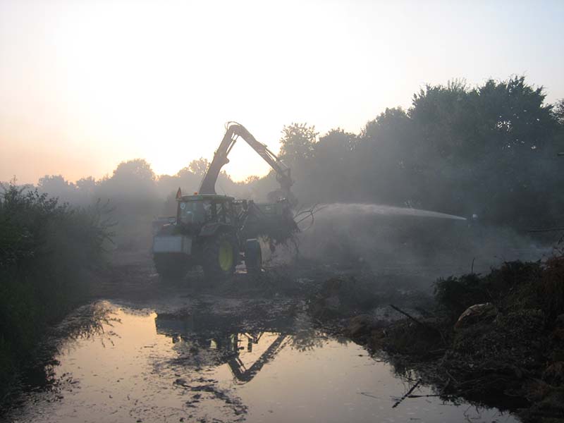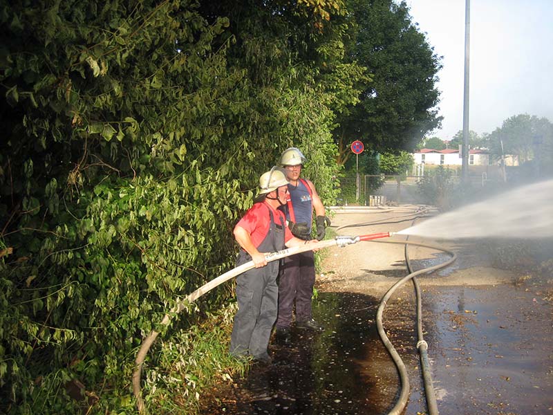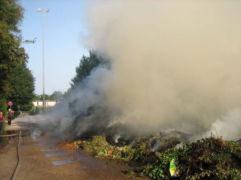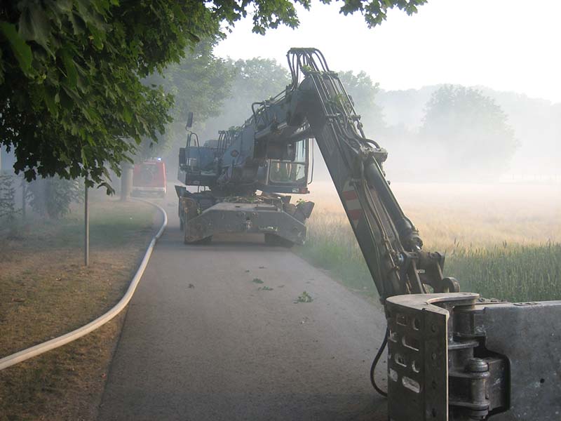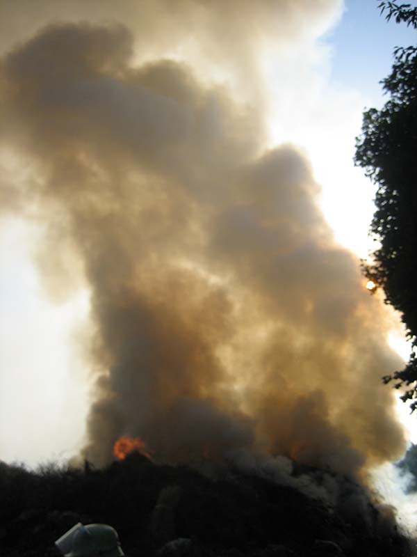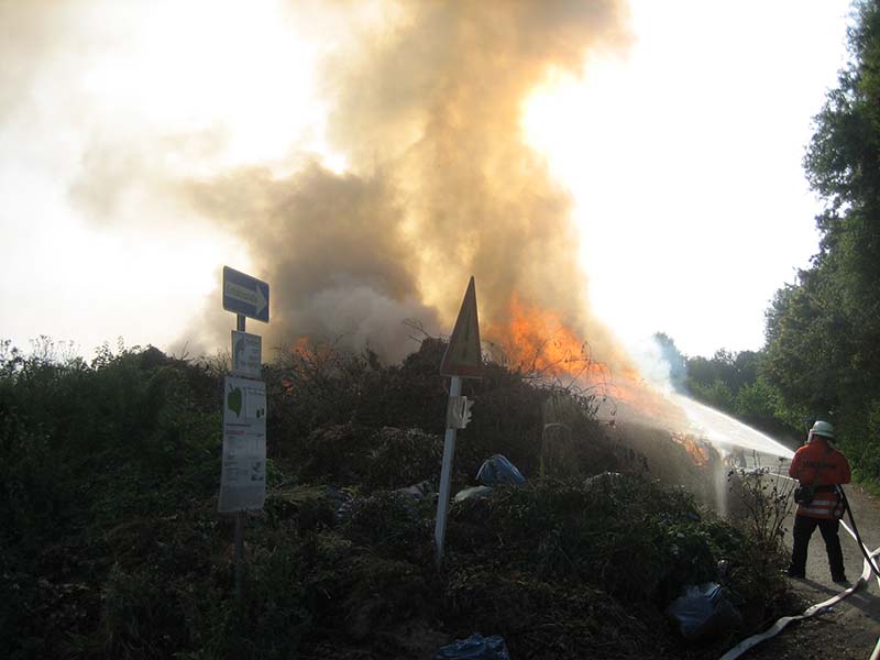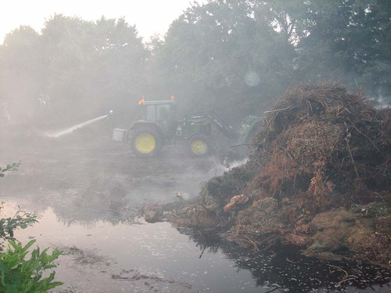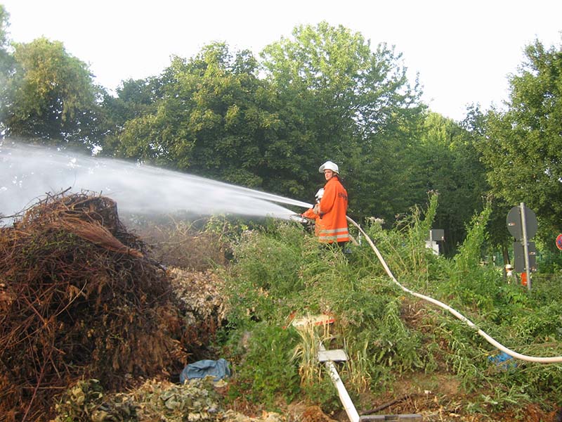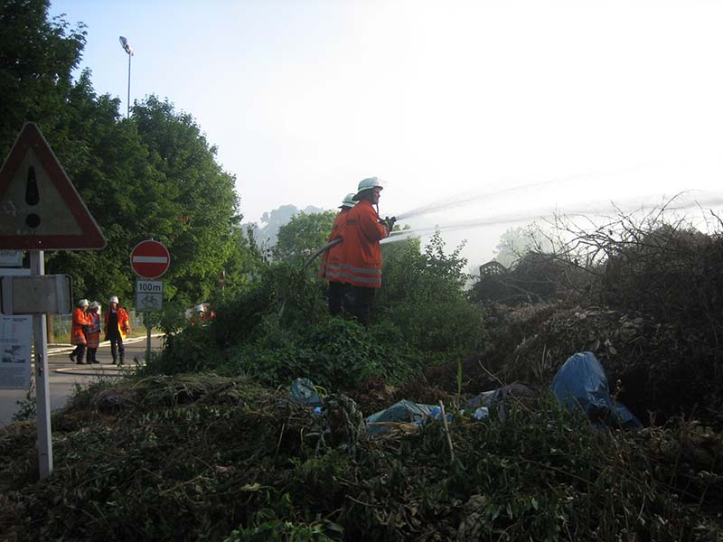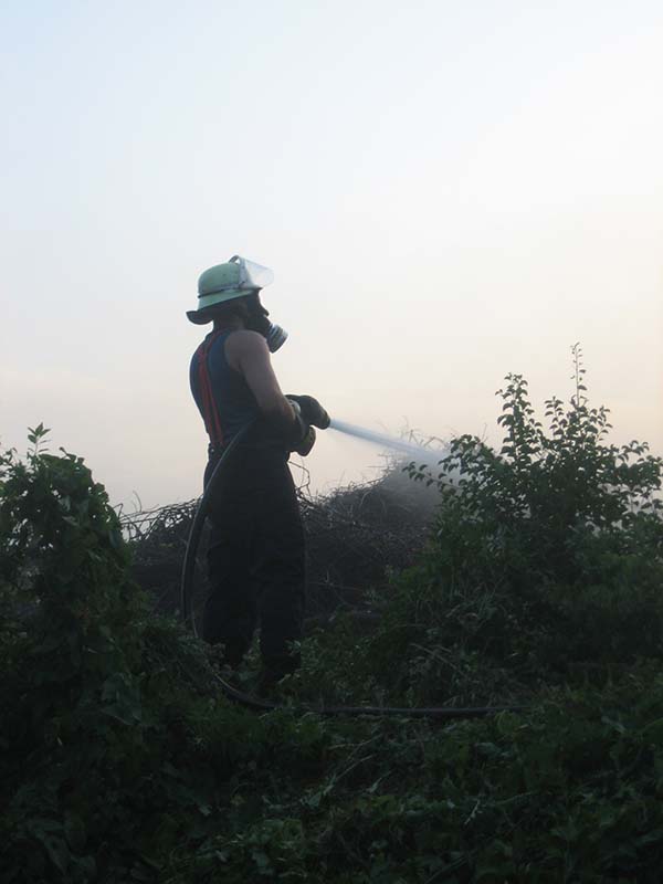 Zum Einsatz kamen 6 C-Rohre, sowie ein Bagger und ein städtischer Traktor, um den Reisighaufen auseinander zu ziehen und das Feuer abzulöschen.