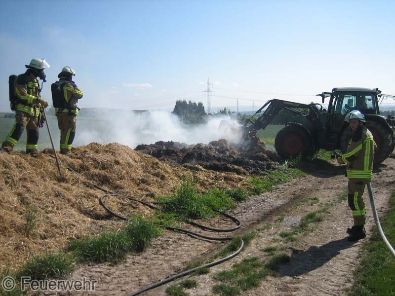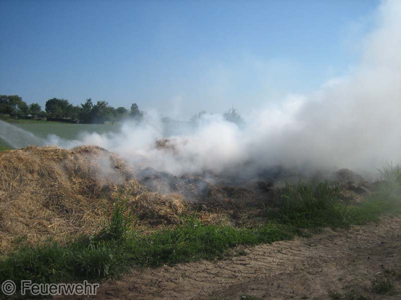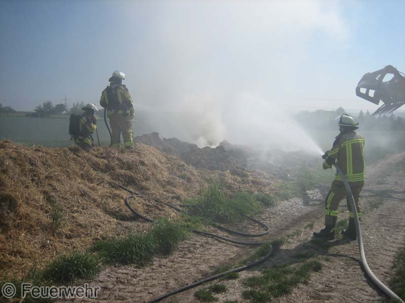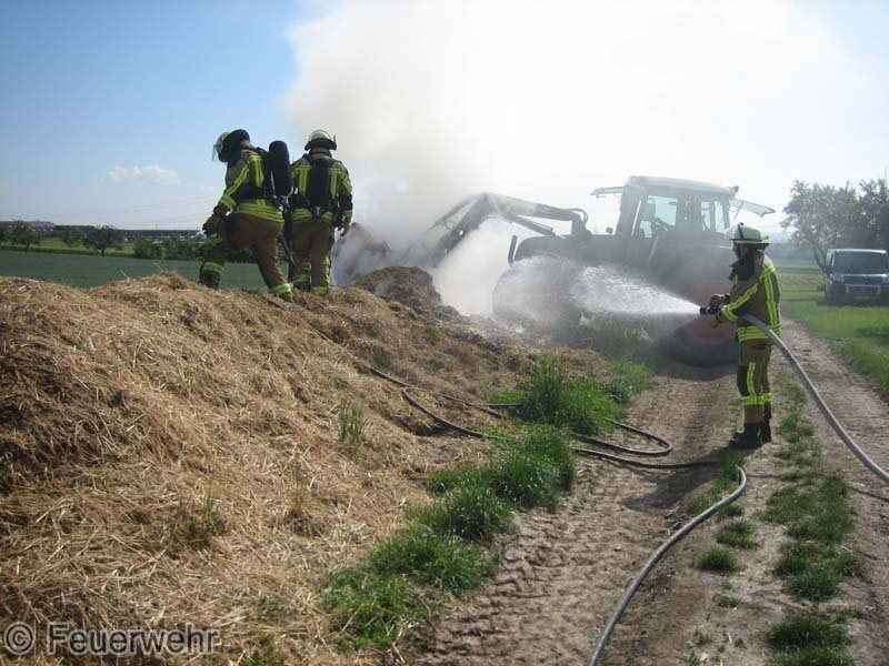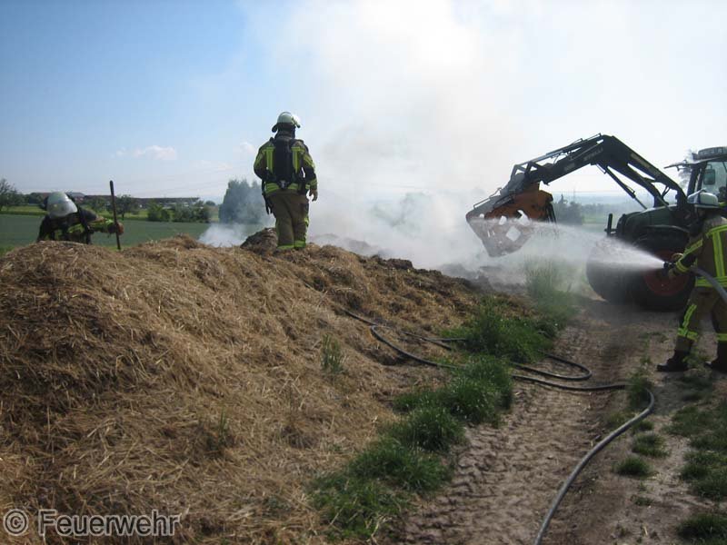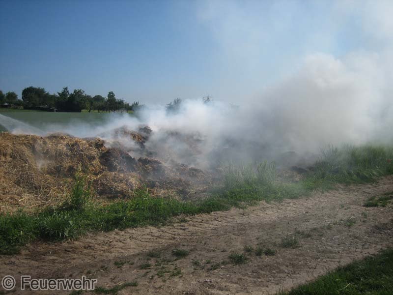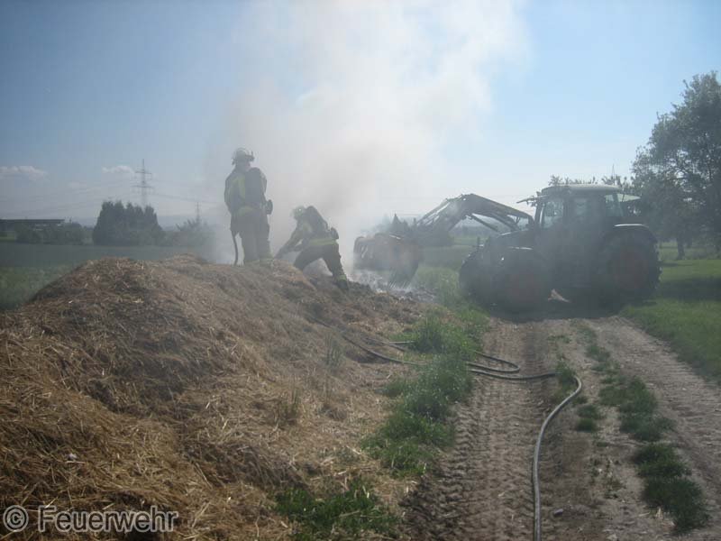 Diesen brennenden Haufen löschte man mit mehreren Strahlrohren ab. Mittels eines Schaufelladers verteilte man dann den Strohhaufen auf dem Grundstück, um mit Nachlöscharbeiten zu beginnen.