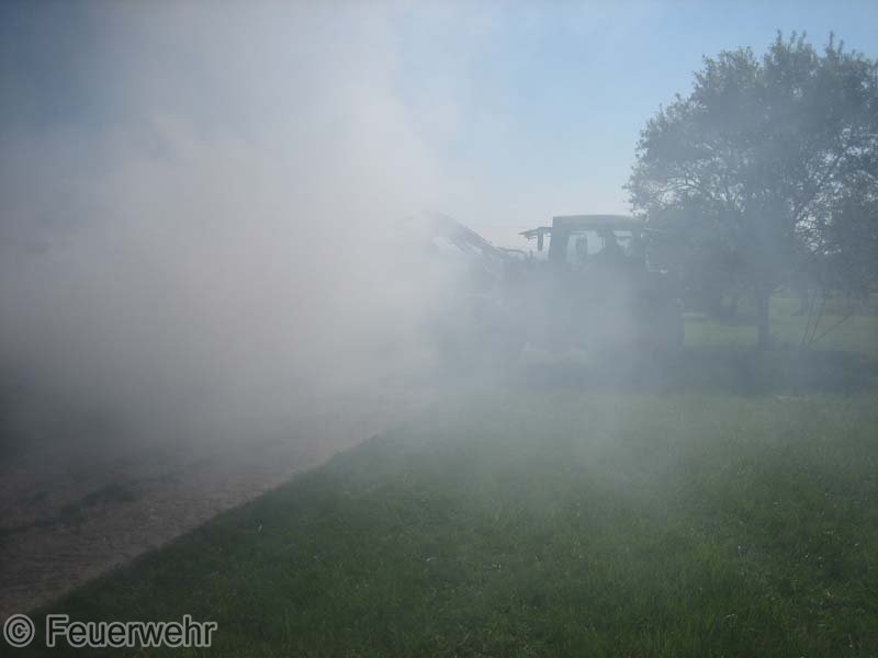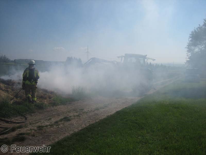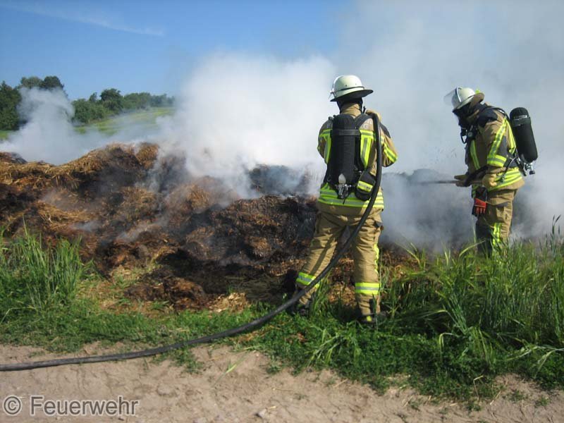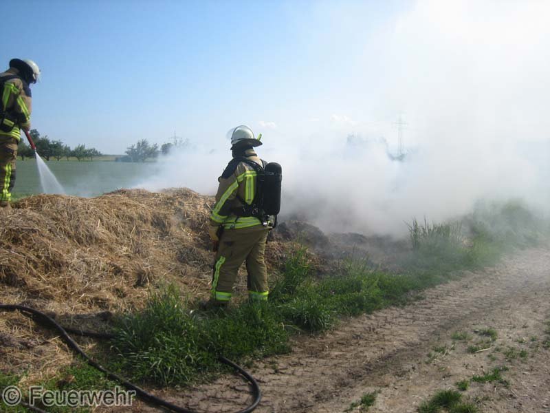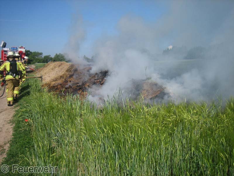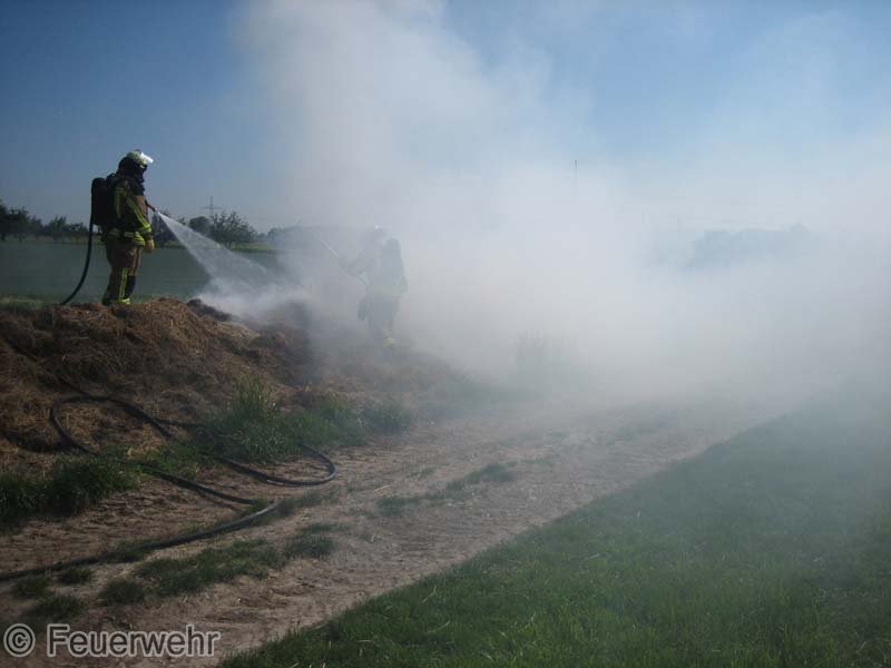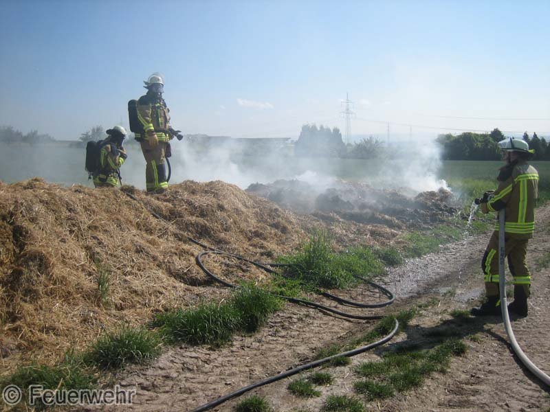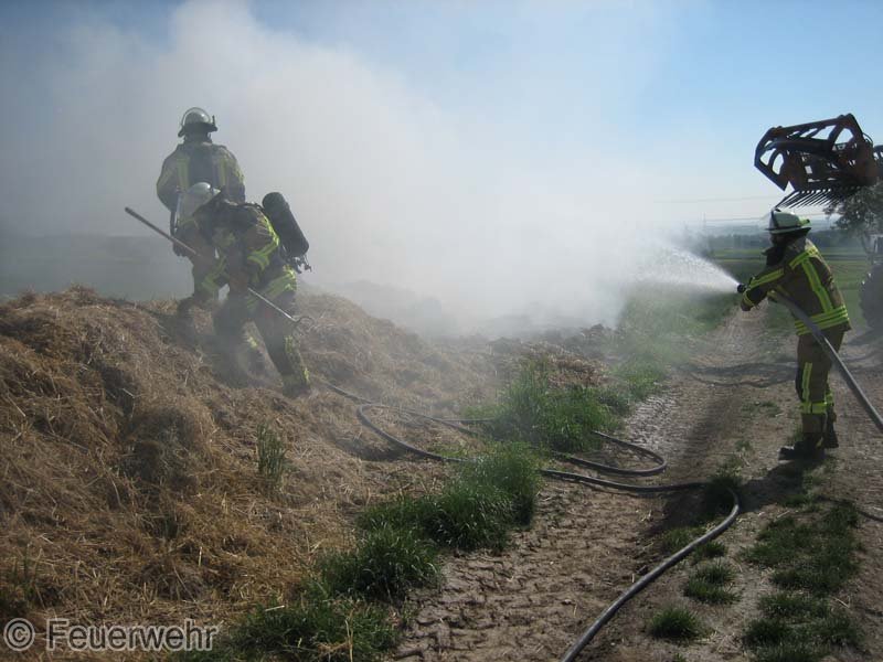 Diesen brennenden Haufen löschte man mit mehreren Strahlrohren ab. Mittels eines Schaufelladers verteilte man dann den Strohhaufen auf dem Grundstück, um mit Nachlöscharbeiten zu beginnen.