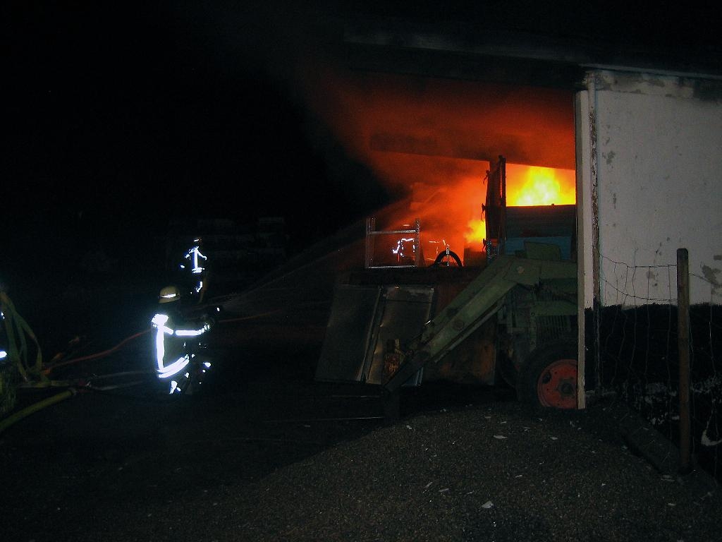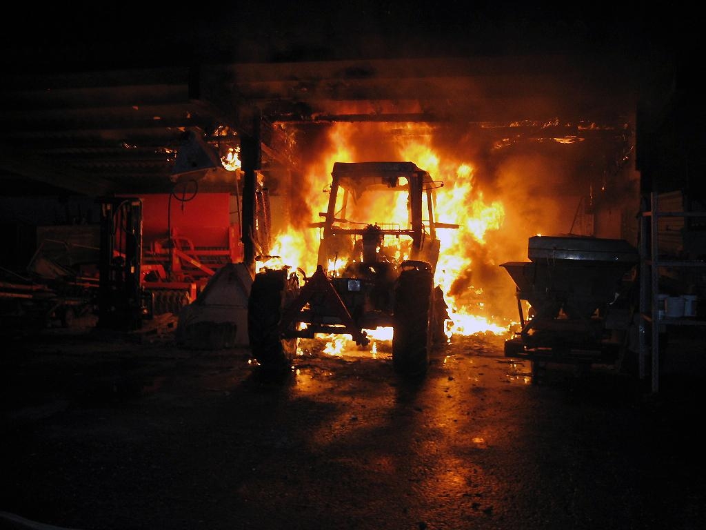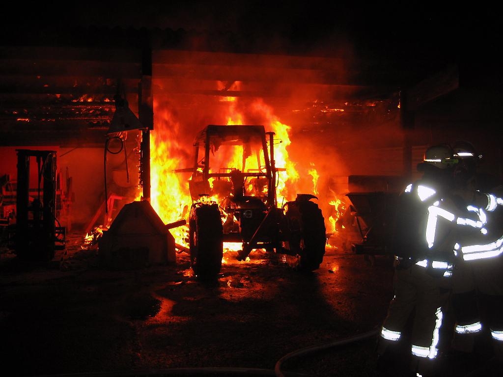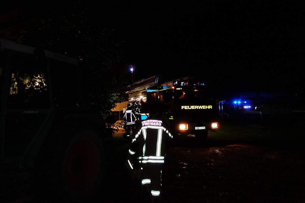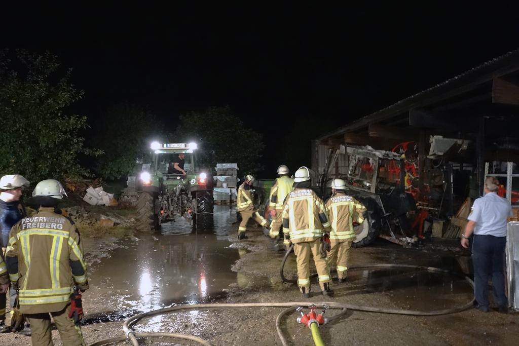 Zu einem Brand in einem landwirtschaftlichen Anwesen in der Monreposstraße wurde die Feuerwehr Freiberg am 28.07.2016, um 21:58 Uhr gerufen. Beim Eintreffen der Feuerwehr stand ein Traktor in einer offenen Fahrzeughalle im Vollbrand. Teile der Dachkonstruktion brannten ebenfalls schon. Drei Trupps mit Atemschutz übernahmen mit drei C-Rohren die Brandbekämpfung. Nach den ersten Löscharbeiten wurde der Traktor aus der Halle herausgezogen und weiter abgelöscht. Das Umfeld des Brandes wurde ebenfalls mehrfach abgelöscht und auch mit einer Wärmebildkamera kontrolliert. Anschließend konnte die Einsatzstelle dem Besitzer übergeben werden.