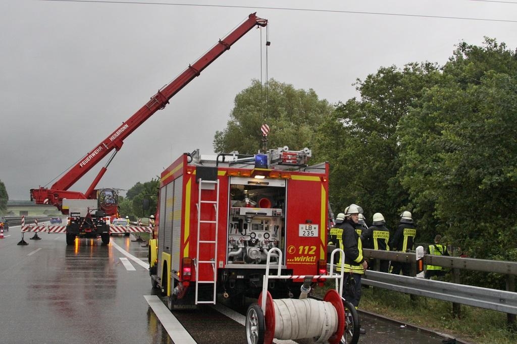 Bei diesem Einsatz war die Feuerwehr Freiberg mit den Fahrzeugen ELW 1, HLF 20/16, LF 20-L, KdoW und 35 Feuerwehrleuten ausgerückt. Die Feuerwehr Ludwigsburg war mit den Fahrzeugen ELW 1, KdoW, HLF 20/16, RW 2 und 18 Mann im Einsatz. Die Feuerwehr Pleidelsheim war mit dem MTW und einem Mann vor Ort. Die Berufsfeuerwehr Heilbronn war mit dem ELW 1, Feuerwehrkranwagen FwK, Gerätewagen-Wasser GW-W, KdoW und neun Mann an der Einsatzstelle. Vom DRK Ludwigsburg war ein Rettungswagen, ein Krankentransportwagen, der Notarztzubringer und insgesamt sechs Rettungskräfte, vom DRK aus Bietigheim-Bissingen ein weiterer Notarztzubringer und ein Rettungswagen mit drei Sanitätern und einem Notarzt und vom ASB aus Besigheim ein weiterer Rettungswagen mit zwei Sanitätern an der Einsatzstelle. Von der Verkehrspolizei Stuttgart-Vaihingen waren insgesamt drei Streifenwagen mit sechs Beamten vor Ort. Außerdem war die Autobahnmeisterei Ludwigsburg mit ihren Fahrzeugen im Einsatz.