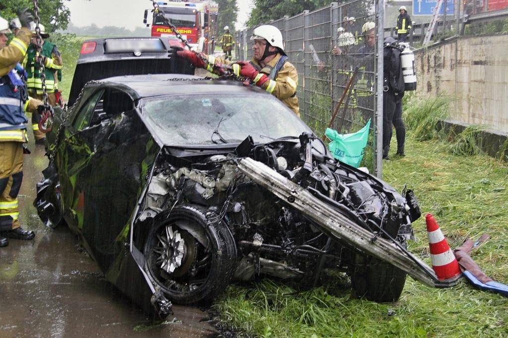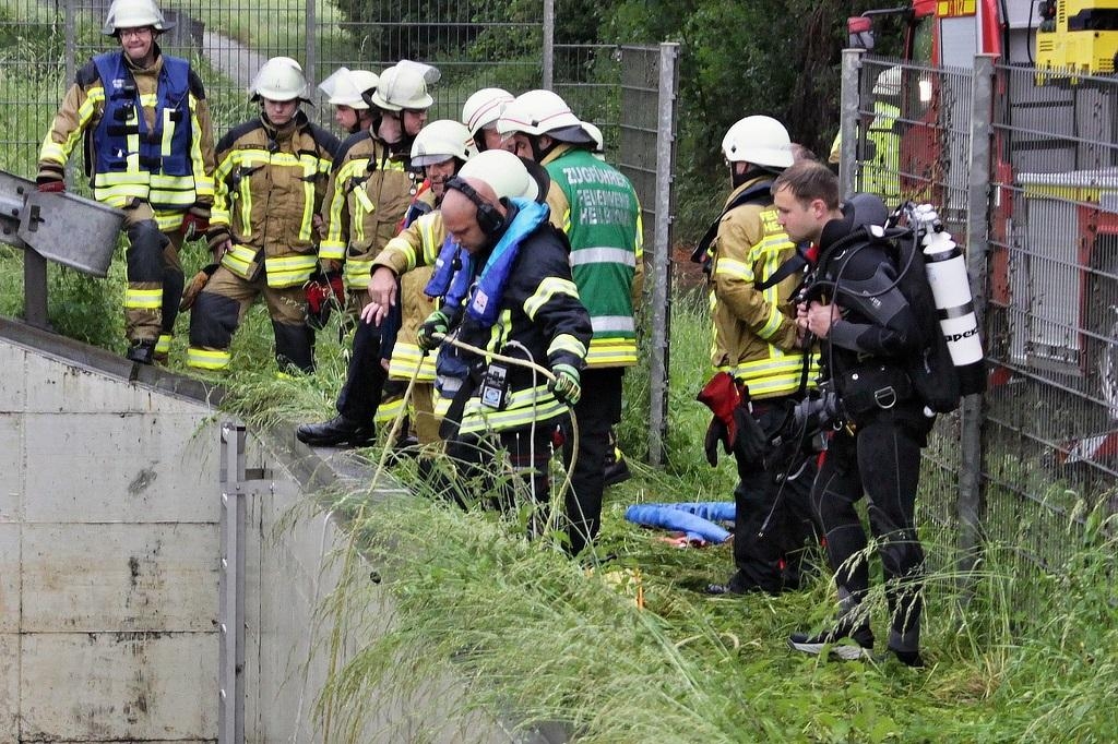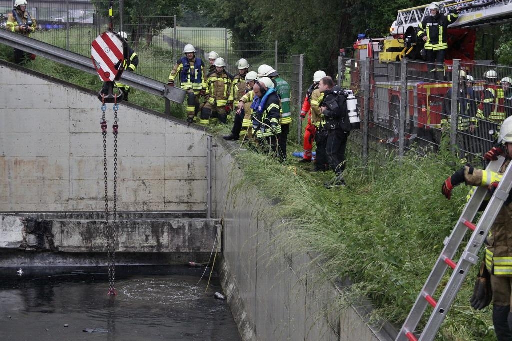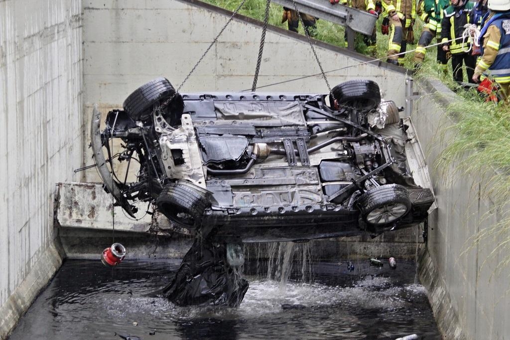 Am 04.06.2017 kam um 5:37 Uhr ein PKW auf der Autobahn A 81 an der Ausfahrt Pleidelsheim in Fahrtrichtung Heilbronn von der Fahrbahn ab und stürzte in ein Regenüberlaufbecken. Zwei der drei Fahrzeuginsassen konnten sich selbst retten, die dritte Person war im Fahrzeug eingeschlossen. Die angerückten Feuerwehren aus Ludwigsburg und Freiberg sicherten die Unfallstelle ab, konnten mit eigenen Mitteln den PKW nicht aus dem Becken bergen. Deshalb wurde die DLRG und die Berufsfeuerwehr Heilbronn mit einem Kranwagen alarmiert. In Zusammenarbeit aller Kräfte konnte der PKW dann geborgen werden. Anschließend wurde die Einsatzstelle der Autobahnpolizei übergeben.