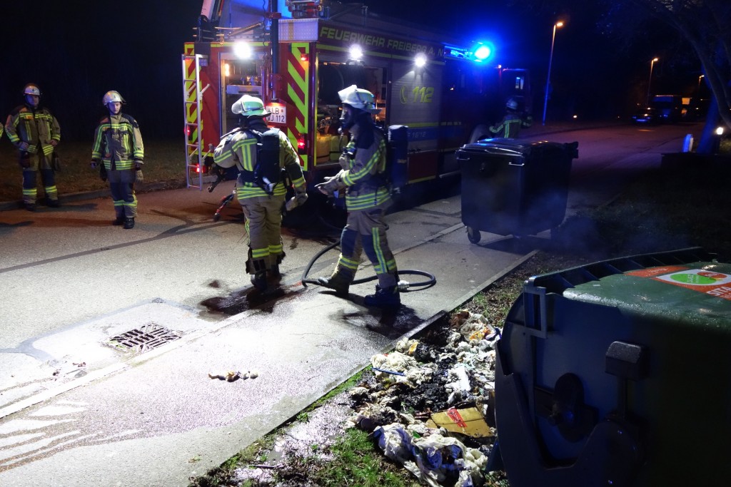Zu einem Mülleimerbrand wurde die Zugschleife 2 der Feuerwehr Freiberg am 01.01.2018, um 17:27 Uhr gerufen. In der Arndtstraße brannte ein 1100 l Müllcontainer. Das Feuer wurde von einem Trupp unter Atemschutz mit dem Schnellangriff des Löschfahrzeuges abgelöscht. Weiterer Schaden entstand nicht.